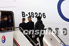 二十六日上午十點三十分,臺商開始陸續(xù)登上臺灣“華航”首架返鄉(xiāng)包機。圖為首位登機臺商走上舷梯。作者:湯彥俊