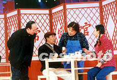 小品老搭擋郭達(dá)(左一)、蔡明(右)與李文啟、李小梅將在2003年中央電視臺(tái)春節(jié)聯(lián)歡晚會(huì)中表演小品《都是親人》,探討尊老敬老話題。作者:王新