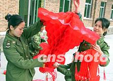 三十日,駐閩某部文藝連營房處處張燈結(jié)彩,一派春意盎然的景象,喜迎羊年新春。圖為今年首次在軍營歡度春節(jié)的女兵將大紅燈籠高高掛起。作者:劉可耕