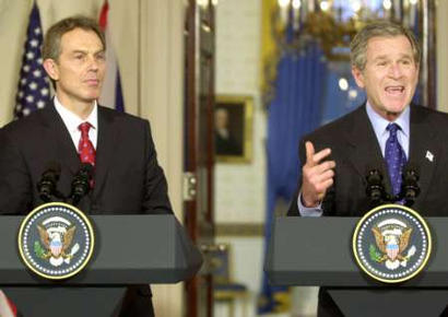 布什在會談結(jié)束后與布萊爾聯(lián)合舉行的記者招待會上說,國務(wù)卿鮑威爾下周將向聯(lián)合國安理會出示證據(jù),證明“薩達(dá)姆正在愚弄世界”。他說,伊拉克問題“將在幾個星期,而不是幾個月內(nèi)得到解決”,美國堅決反對任何將伊拉克問題拖延幾個月后再解決的企圖。