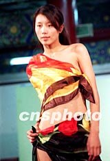 北京模特在春節(jié)文化廟會上表演主題為《江南情思》的系列時(shí)裝,以精簡的裝飾展示美好身材。作者:鄒憲