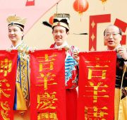 據(jù)臺(tái)灣媒體報(bào)道,胡志強(qiáng)是7日上午與國民黨另兩位“政治明星”臺(tái)北市長馬英九、桃園縣長朱立倫一同在桃園為元宵燈會(huì)造勢。朱、馬、胡三人以福、祿、壽三星造型粉墨登場。