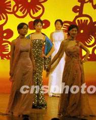 解放軍駐北京某部女戰(zhàn)士在元宵文藝晚會上進行時裝表演。時裝表演在解放軍女兵中很流行,這些軍中少女在節(jié)假日里時常利用報紙、床單等物品,制成時裝在軍營中展示美麗。作者:宋吉河