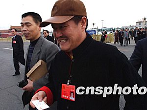 影視明星趙本山三月四日參加全國人大十屆一次會議的預備會途中,忙于接受代表和新聞界遞來的名片。作者:賈國榮