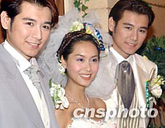 香港藝員朱茵三月四日與來自臺灣的組合TOPTWINZ(騰龍、躍虎)在香港“現(xiàn)代經(jīng)典”影樓拍攝主題為“花團錦簇”的婚紗晚裝作品。錢興強 攝