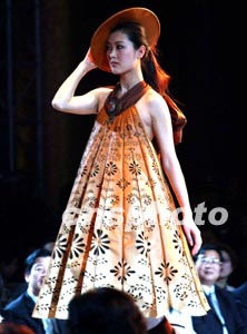 來(lái)自中國(guó)臺(tái)北的服飾佳作參加三月二十五日在北京舉行的“漢帛杯”國(guó)際青年時(shí)裝設(shè)計(jì)師作品大賽,以東方特色的扇面裙裝令人刮目相看。作者:賈國(guó)榮