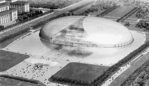 國家大劇院由法國建筑師保羅·安德魯主持設計,設計方為法國巴黎機場公司。國家大劇院建筑屋面呈半橢圓形,由具有柔和的色調和光澤的鈦金屬覆蓋,前后兩側有兩個類似三角形的玻璃幕墻切面,整個建筑漂浮于人造水面之上,行人需從一條80米長的水下通道進入演出大廳,通道兩側被規(guī)劃為藝術博物館、藝術品商場等。大劇院造型新穎、前衛(wèi),構思獨特,是傳統(tǒng)與現代、浪漫與現實的結合。這座“城市中的劇院、劇院中的城市”計劃在2005年以一顆獻給新世紀的超越想象的“湖中明珠”的奇異姿態(tài)出現。