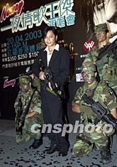 歌星王杰3月28日在香港出席「Neway 一夜情歌王杰演唱會(huì)」記者會(huì)。大會(huì)特別安排幾位身穿迷彩軍服手持步槍的臨時(shí)演員為宣傳演唱會(huì)增添氣氛。演唱會(huì)定于4月20日于紅館舉行。鄧慶樂 攝