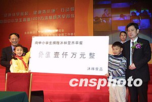 湖南沐林現(xiàn)代食品有限公司董事會(huì)主席伍躍時(shí)30日在北京人民大會(huì)堂通過中國(guó)光彩事業(yè)促進(jìn)會(huì)、中國(guó)少年先鋒隊(duì)全國(guó)工作委員會(huì)等單位,向中小學(xué)生捐贈(zèng)價(jià)值1000萬(wàn)元人民幣的沐林谷物營(yíng)養(yǎng)早餐,拉開“健康從早做起,健康奔小康”活動(dòng)序幕。作者:趙振清