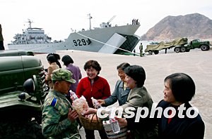 駐守在中國渤海深處一座小島上的數(shù)百名民眾,得知與他們朝夕相處的解放軍某導(dǎo)彈部隊官兵要外出執(zhí)行春季任務(wù)時,紛紛送來海產(chǎn)品等到碼頭為官兵送行。作者:崔文斌