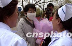 中新社北京四月十七日電(記者曾利明)北京佑安醫(yī)院今天舉行了一個(gè)特別的歡送會(huì),歡送又一位痊愈的非典型肺炎患者出院。醫(yī)院的院長(zhǎng)、書(shū)記、參加治療的醫(yī)生和護(hù)士代表一起把患者送出病區(qū)。站在醫(yī)院大門(mén)口的康復(fù)患者小石是為個(gè)二十歲的大學(xué)生。滿臉喜色的他,一邊接受兩位護(hù)士獻(xiàn)上的鮮花,一邊點(diǎn)頭向半個(gè)多月來(lái)為他精心治療、護(hù)理的大夫護(hù)士致謝:“謝謝你們!謝謝佑安醫(yī)院!”