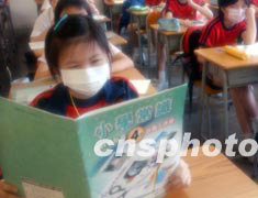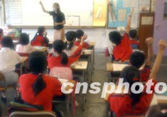 隨著香港“SARS”疫情的逐漸穩(wěn)定,香港數(shù)百所小學(xué)的高年級學(xué)生五月十二日開始復(fù)課。在灣仔學(xué)校復(fù)課的第一天,老師向?qū)W生提問有關(guān)如何防預(yù)“SARS”的基本知識。中新社記者 錢興強(qiáng) 攝