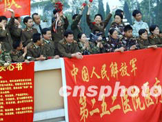 十四日,解放軍總政歌舞團(tuán)到北京小湯山“非典”定點(diǎn)醫(yī)院慰問醫(yī)護(hù)人員,受到熱烈歡迎。作者:安然