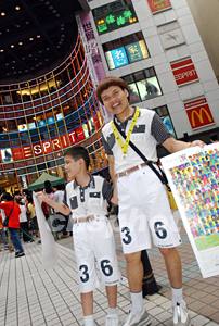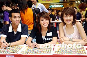 名歌星容祖兒、梁漢文及何韻詩18日在世貿(mào)中心為購買門票支持善舉的歌迷簽名。