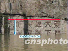 三峽水利樞紐壩前水位6月6日上午10時,達到121.41米。瞿塘峽平湖景象已呈現(xiàn)出來,而三峽著名的夔門摩崖石刻此時已經(jīng)被淹沒。圖為6月4日當水位達到116.33米時,夔門摩崖石刻向游人展示出告別前的景觀。中新社 圖
