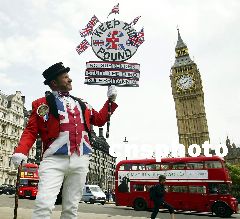 6月9日,英國(guó)財(cái)政大臣戈登·布朗宣布英國(guó)暫時(shí)不會(huì)加入歐元區(qū)。圖為英鎊的堅(jiān)定支持者在英國(guó)首都倫敦街頭高舉標(biāo)語(yǔ)牌,號(hào)召維護(hù)英鎊,抵制歐元。Ic/cnsphoto 攝