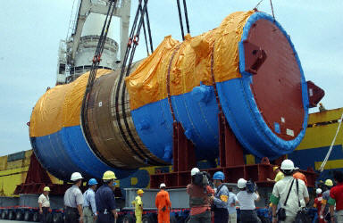20日,載運(yùn)第四核能電廠(“核四”)反應(yīng)爐壓力容器的荷蘭籍巴卡尼重件船,在臺(tái)“海巡署”巡防艇戒護(hù)下從基隆港出發(fā),駛抵貢寮碼頭卸載;期間,基隆區(qū)漁會(huì)10多艘漁船在航道上試圖接近重件船,但均被巡防艇攔阻!芭_(tái)電”預(yù)定今天可以完成卸載,將等待明年土木工程完成后安裝。