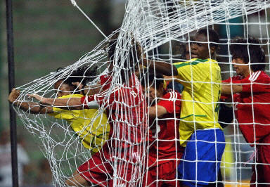 巴西隊(duì)開(kāi)場(chǎng)后占據(jù)優(yōu)勢(shì)。第23分鐘,盧西奧長(zhǎng)傳,阿德里亞諾突入禁區(qū),將球挑過(guò)魯斯圖的頭頂,巴西隊(duì)1比0領(lǐng)先。