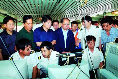 黃鎮(zhèn)東與市委常委、秘書長何事忠,副市長吳家農(nóng)、趙公卿一道,馬不停蹄地乘船趕赴現(xiàn)場。在船艙內(nèi),黃鎮(zhèn)東同國家安全生產(chǎn)監(jiān)督管理局副局長閃淳昌等國務(wù)院事故調(diào)查組同志一道,認(rèn)真聽取了事發(fā)經(jīng)過、施救情況和善后安排等情況的匯報,并對下一步探測打撈工作提出了要求。黃鎮(zhèn)東一行還登上正在緊張作業(yè)的打撈船,看望慰問探測打撈人員,對大家?guī)滋靵磉B續(xù)緊張的工作給予了肯定。在作業(yè)臺前,黃鎮(zhèn)東詳細(xì)詢問了打撈公司的裝備、事故地點(diǎn)的水文特征、探測作業(yè)的最新進(jìn)展等,并要求探測單位鎖定重點(diǎn)水域進(jìn)行加密探測,盡快確定沉船位置。打撈公司則要進(jìn)一步熟悉水情,科學(xué)論證,縝密部署,迅速制訂打撈方案,在確保安全前提下實(shí)施沉船打撈。他還特別叮囑要注意在打撈和搜尋中的安全,確保整個搜救工作萬無一失。