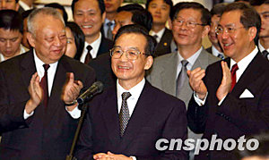 六月三十日,國務(wù)院總理溫家寶參觀香港大學(xué)醫(yī)學(xué)院,并與教授們談笑。中新社記者 潘索菲 攝