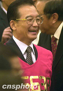 國(guó)務(wù)院總理溫家寶六月三十日下午到香港交易所參觀,港交所贈(zèng)送一件編號(hào)“6638”的出市背心予溫家寶。中新社記者 錢(qián)興強(qiáng) 攝