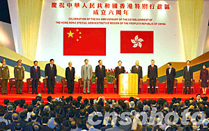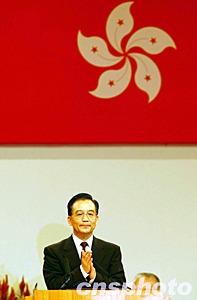 溫家寶說,六年來的實踐充分表明∶鄧小平先生提出的“一國兩制”偉大構(gòu)想是具有強大生命力的;“一國兩制”、“港人治港”、高度自治的基本方針和香港特別行政區(qū)基本法是完全正確的;掌握了自己命運的香港人完全有能力治理好香港。