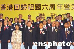 中新網(wǎng)7月4日電 香港廣東社團(tuán)總會(huì)昨晚在香港會(huì)議展覽中心五樓大會(huì)堂隆重舉行“慶祝香港回歸祖國六周年聯(lián)歡宴會(huì)”。全國政協(xié)副主席霍英東﹑行政長官董建華等蒞臨主禮。