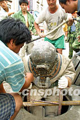 在距離事故現(xiàn)場(chǎng)百米外的中山南路路中央,高溫酷熱下,一名施工人員卻要身穿重一百八十斤的潛水服從地面窨井下到水中,用水泥堵住地底因施工滲水而形成的漏洞。據(jù)現(xiàn)場(chǎng)施工人員透露,地下因施工滲水形成多個(gè)大洞,經(jīng)過(guò)幾天搶險(xiǎn),如今還剩最后一個(gè),眼前這位潛水人員下水要堵的洞口直徑達(dá)二點(diǎn)二米。