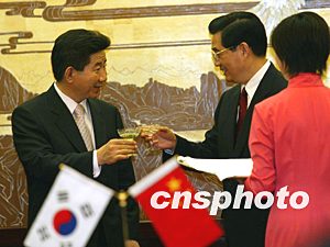盧武鉉表示完全贊同胡錦濤提出的建議。他指出,韓中關(guān)系的穩(wěn)定發(fā)展,符合兩國(guó)利益,有利于地區(qū)的和平與穩(wěn)定。韓方愿擴(kuò)大韓中兩國(guó)人員交往,特別是高層互訪和青少年的交流,加強(qiáng)經(jīng)貿(mào)關(guān)系,推動(dòng)雙方在文化、教育、社會(huì)等領(lǐng)域的合作,建立韓中全面合作伙伴關(guān)系。