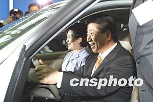 盧武鉉與夫人興致勃勃地一起試乘下線新車。中新社記者:毛建軍