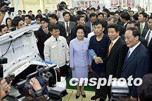 韓國總統(tǒng)盧武鉉九日下午在北京市代市長王岐山的陪同下,參觀北京現(xiàn)代汽車生產(chǎn)基地,并向生產(chǎn)線上的工人表示問候。中新社記者:毛建軍