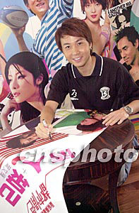 歌星黃凱芹7月24日在香港出席新城電臺(tái)廣播劇《都市情色》記者會(huì)。黃凱芹在宣傳墻報(bào)自已的肖像上簽名。作者:鄧慶樂(lè)