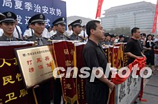 北京警方二十七日舉行“夏季治安攻勢追繳物品發(fā)還儀式”,部分被盜汽車失主取回汽車后向警方贈送錦旗。中新社記者:任海霞