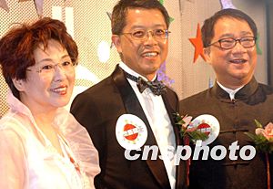 全球第一條二十四小時中文娛樂新聞頻道香港《有線娛樂新聞臺》日前正式啟播,圖為藝員李司棋(左)、香港電視有線公司主席吳天海(中)和徐小明在啟播儀式上。中新社記者:錢興強