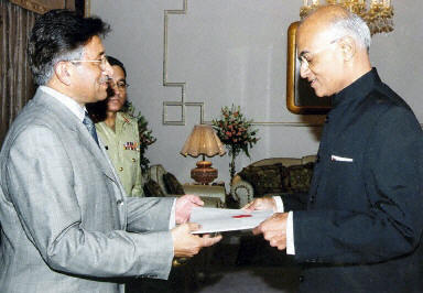 8月9日,印度新任命的駐巴基斯坦高級(jí)專員(大使)西夫·沙恩卡爾·梅農(nóng)(右)向巴基斯坦總統(tǒng)穆沙拉夫遞交了國(guó)書。此前,在印度首都新德里也舉行了同樣的儀式。這標(biāo)志著印巴兩國(guó)正式全面恢復(fù)外交關(guān)系。