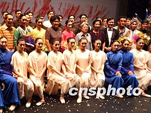中國副總理吳儀八月十日晚觀看中央芭蕾舞團新版《大紅燈籠高高掛》,與導演張藝謀和創(chuàng)作演出人員合影祝賀首演成功。中新社記者:賈國榮