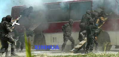 中國特戰(zhàn)隊(duì)員在依托步戰(zhàn)車進(jìn)行反恐演練。在擔(dān)負(fù)“城鎮(zhèn)清剿,解救人質(zhì)”的參演部隊(duì)中,還有一支由100多名指揮官和士兵組成的反恐分隊(duì)。這支分隊(duì)從組建至今,曾多次為外軍領(lǐng)導(dǎo)做過摩托車特技、飛車抓捕、攀登、戰(zhàn)術(shù)課目等軍事表演,受到了外軍領(lǐng)導(dǎo)人的高度評(píng)價(jià)。據(jù)介紹,在正式演習(xí)之前,這支反恐特戰(zhàn)分隊(duì)的隊(duì)員們每天都定下一個(gè)目標(biāo),利用臨睡之前的半個(gè)小時(shí)進(jìn)行演練。隊(duì)長薛峰每天都與戰(zhàn)士們汗流浹背地在野外山地苦練,一個(gè)動(dòng)作,一招一式,絲毫也不馬虎。這支部隊(duì)的負(fù)責(zé)人曹鴻建說,反恐作戰(zhàn)不能沿用傳統(tǒng)的思維方式和戰(zhàn)法,為了應(yīng)付不同環(huán)境、不同條件下的突發(fā)事件,他們長年進(jìn)行高強(qiáng)度、高難度的全面錘煉,目前,官兵們已全部進(jìn)入臨演狀態(tài),有信心完成這次多國聯(lián)合演習(xí)中的任務(wù)。
