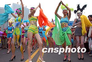 八月十七日下午,第十三屆青島國際啤酒節(jié)舉行盛大的狂歡巡游活動,由六十名女模特組成的“泳裝彩繪方隊”成為本次巡游活動的最亮點。中新社記者:張煒