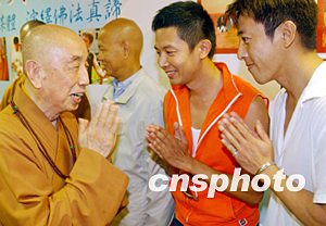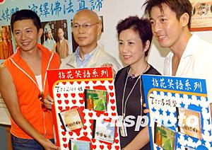 由星加坡福海禪院與好合拍多媒體集團(tuán)合作出版的《拈花笑語(yǔ)系列》光盤(pán)發(fā)布會(huì)八月十八日在香港舉行,圖為明義法師(左)與香港藝員何寶生(中)、呂頌賢(右)在新聞發(fā)布會(huì)上。中新社記者:錢(qián)興強(qiáng)