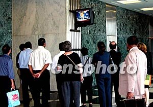 聯(lián)合國(guó)駐巴格達(dá)總部大樓十九日被炸后,紐約聯(lián)合國(guó)總部的工作人員聚集在大廳內(nèi)的電視機(jī)前收看新聞,關(guān)注著在巴格達(dá)同事的安全。中新社記者:趙海燕
