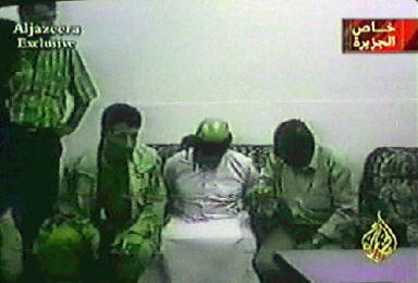 中新網(wǎng)8月21日電 “半島”電視臺(tái)新聞節(jié)目抓圖。畫面上為8月20日一名庫(kù)爾德戰(zhàn)士看守著薩達(dá)姆的得力助手--伊拉克副總統(tǒng)塔哈·亞辛·拉馬丹。庫(kù)爾德人于8月19日在摩蘇爾市的突襲行動(dòng)中抓獲了拉馬丹。拉馬丹在美軍55人撲克牌通緝令中名列第20位。至此,通緝名單上已有38人被捕或被擊斃。(春風(fēng))