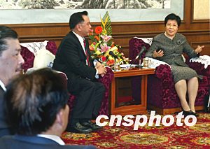 國務(wù)院僑辦主任陳玉杰二十二日在北京釣魚臺會見以余國春(左二)為團長的香港廣東社團總會訪京團一行,雙方就居民個人可申請辦理赴港游等問題交換意見。中新社記者:鄭萍萍