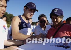 美西時(shí)間二十四日清晨,正在美國訪問的臺(tái)北市長(zhǎng)馬英九沿舊金山灣海岸參加“跑出健康”晨練活動(dòng)并為參加清晨慢跑的晨練者簽字留念。作者:陳鋼