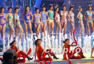 據(jù)美國《世界日報》報道,始于1973年的港姐選舉,今年是第31屆。本屆決賽主題是“秋水伊人――脫俗出塵”,主辦單位香港電視廣播有限公司(無線)特意斥巨資在場內(nèi)搭建大型游泳池突顯主題。佳麗們時而在泳池中“芙蓉出水”,時而在封蓋的泳池上歌舞。背景臺上描繪的是典雅的中國山水畫,映襯出佳麗們脫俗的氣質(zhì)。
