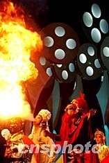 今秋在北京北展劇場(chǎng)舉行的中國(guó)電影華表獎(jiǎng)?lì)C獎(jiǎng)晚會(huì)上,京劇名家現(xiàn)場(chǎng)表演噴火絕活,為晚會(huì)助興。中新社記者:武仲林