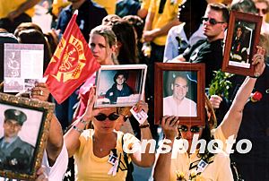 在“九一一”恐怖襲擊事件中逝去的紐約消防員親屬們,手舉親人的照片,參加在世貿(mào)中心遺址舉行的紀(jì)念活動(dòng)。作者:龔文謨