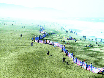 中新網(wǎng)9月15日電 由舊金山華裔藝術(shù)家趙建海設(shè)計的大地藝術(shù)作品旗海“自由頌”,九月七日在紐約自由神像島上飄揚(yáng),13日再現(xiàn)舊金山市海灘。