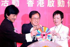 香港旅游發(fā)展局9月15日推出全新的「香港-樂(lè)在此,愛(ài)在此!」全球廣告宣傳活動(dòng),政務(wù)司長(zhǎng)曾蔭權(quán)[中]、旅游發(fā)展局主席周梁淑怡[右]及香港旅游大使成龍出席主持啟動(dòng)儀式。作者:洪少葵