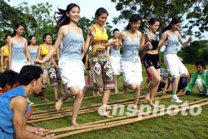 參加第五十三屆世界小姐中國總決賽的選手十六日在三亞向海南黎族青年學(xué)習(xí)傳統(tǒng)的竹桿舞。中新社記者:毛建軍