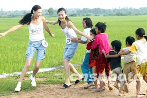 參加第五十三屆世界小姐中國總決賽的選手十六日拍攝外景時,在三亞鄉(xiāng)間與農(nóng)家孩子玩起“老鷹捉小雞”的游戲。中新社記者:毛建軍
